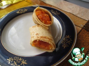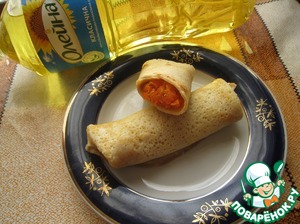 Я хочу предложить блинчики с очень вкусной и сладкой морковной начинкой. Это бюджетный вариант борьбы с авитаминозом. Кроме того яркий цвет начинки поднимет настроение и поможет справиться с хандрой.