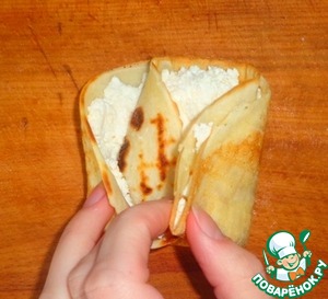 Половину блинчика смазываем творожно-зефирной массой и накрываем другой стороной. На середину кладем 1-2 ч. л. начинки (это будет серединка розочки).