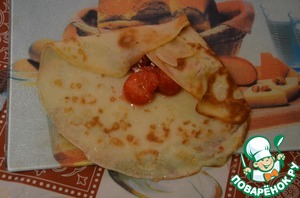 Блинчики нужно свернуть таким образом, чтобы даже если из клубники будет подтекать сок, то он бы оставался внутри. Я делаю такие блинчики "конвертиком".