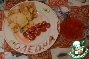Приготовить блины по любимому рецепту. У меня блины на сыворотке с добавлением подсолнечного масла "Олейна". Клубнику тщательно промыть, в моём случае разморозить (за окном зима, но морозильная камера даёт возможность и в холодное время года побаловать себя вкусными домашними ягодами).