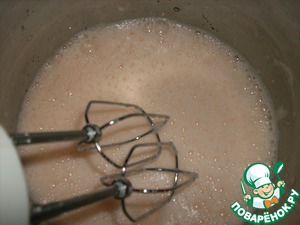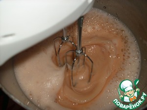В яичную пену вливаем слегка подогретое молоко и также успешно доведем все до пенного состояния.