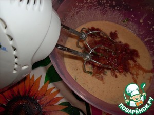 Измельченный красный болгарский перец добавляем ко второй части блинного теста и также тщательно перемешиваем.