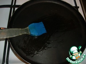 Блинную сковороду старательно смазываем растительным маслом. Разогревам сковороду на плите.
