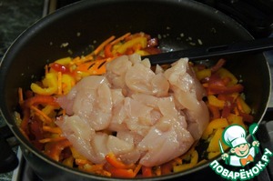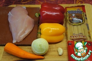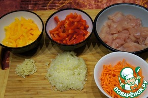 Подготовить продукты. Филе обмыть и обсушить бумажным полотенцем. Морковь и лук почистить. У меня красный перец был очень крупный, поэтому я взяла половинку, а желтого примерно 2/3 (остальное утащила внучка).