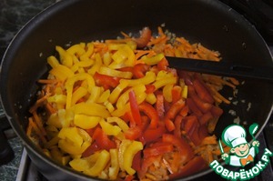 Морковь и перец нарезать соломкой, лук и чеснок измельчить. -