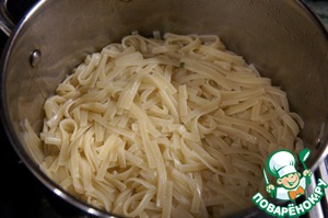 Лапшу отварить до состояния "аль дэнте", откинуть,