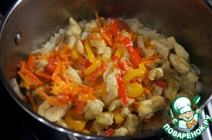 Затем соединить с овощами и прогреть на слабом огне 3 минуты.