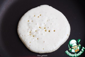 4. Сковороду хорошо разогреть. На сухую (!) сковороду вылить количество теста, необходимое для панкейка. У меня для этого отлично подходит поварешка от мультиварки, самый подходящий размер. Немного разровнять тесто ложкой (при необходимости). Как только на поверхности появились пузырьки, но еще не лопнули, перевернуть панкейк на другую сторону и печь до зарумянивания. Как только панкейк начинает свободно сдвигаться, он готов.