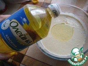 Всыпаем муку через сито (частями), перемешивая венчиком. Добавляем растительное масло "Олейна", а затем постепенно воду, постоянно мешая. Количество воды приблизительное, тесто должно быть консистенции густого кефира.