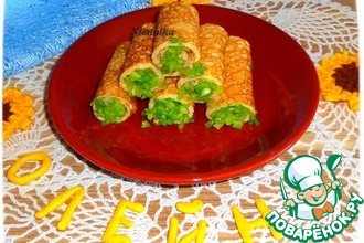 Блинчик завернуть в начале, выложить свернутый блин с сыром и брокколи (как на картинке). Все вместе свернуть в рулет.