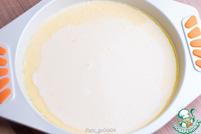 3. Как только масло растопится, вынуть форму и покачать, чтобы масло равномерно покрыло дно и немного стенки формы. Вылить блинную смесь в масло и выпекать в духовке около 15 минут. Процесс по превращению теста в блин очень захватывающий. Духовку не открывать! Блин должен подняться с боков и зарумянится по краям.