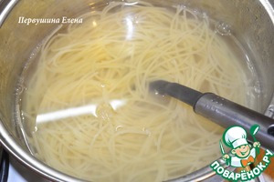 Вскипятить воду, посолить. Взять спагетти, отделить нужное количество и погрузить в кипяток. Отдельно поставить воду для креветок. Отварить спагетти «на зубок». Оставить доходить до полной готовности в горячей воде.