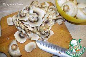 Грибы нарезать колечками, толщиной примерно в 1,5мм.