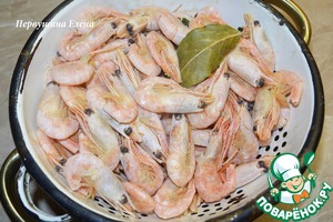 В воду для креветок добавить соль, лимон, лавр и пол пучка укропа. Довести до кипения, закинуть креветки. Снова довести до кипения и сразу выключить огонь. Слить креветки, оставить остывать.