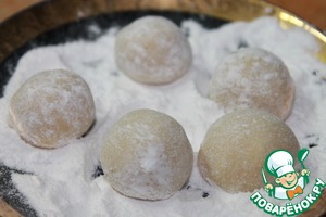 Сформировать маленькие шарики таким образом, чтобы рис был внутри и обвалять в сахарной пудре.