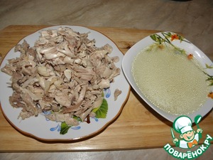Курицу отварить ( кожу удалить, бульон чуть подсолить) и нарезать, отлить 2 чашки бульона.