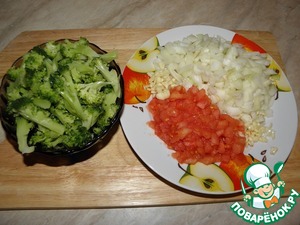 Разогреть на сковороде сливочное с растительным маслом, обжарить лук, помидор, чеснок, сырой рис, курицу и брокколи в течении 2-4минут ( посолить, поперчить по вкусу