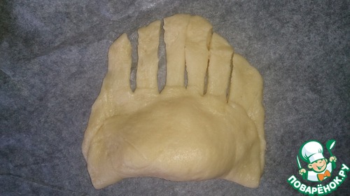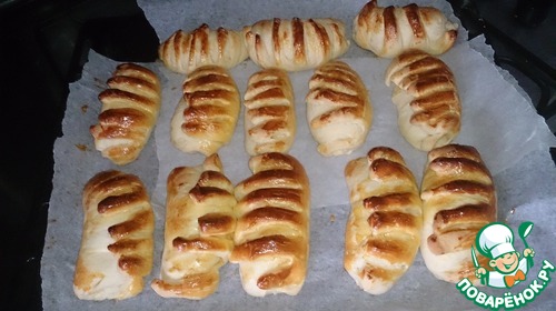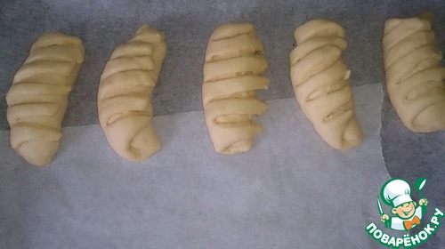 1. Подошедшее тесто обмять, разделить на 14 кусочков, каждый раскатать, отступив 2 см-3см от края положить крем, накрыть второй частью и залепить края, оставшейся кусочек теста надрезать полосками и свернуть (см. фото)