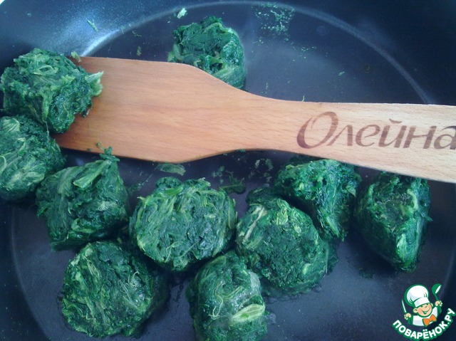 Подготовьте начинку. Для этого измельчите шпинат и подсушите его на сковороде. Остудите. Если у вас шпинат свежий, то его следует немного отварить и откинуть на дуршлаг, а затем порубить.