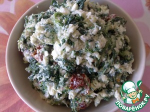 Разомните рикотту вилкой, добавив измельченный шпинат, вяленые томаты, соль, мускатный орех и натертый на мелкой терке сыр. Все хорошо перемешать.
