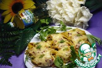 Полейте креспелле соусом бешамель, по желанию поверхность можно посыпать тертым сыром. Поставьте форму в разогретую до 180*С духовку на 20 минут.