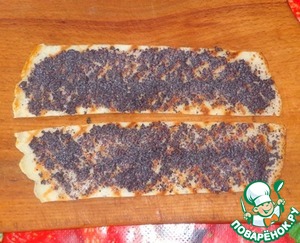 Смазываем полосочки маковой начинкой, накладываем полоски друг на друга и на край кладем несколько изюминок.