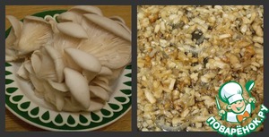 • Пока наше тесто подходит, мы займемся начинкой. В рецепте указаны сухие грибы ( 50 гр. ), но я предпочитаю свежие. В данном случае вешенки. Для этого мы грибы помыть и мелко порезать. Лук мелко порезать. В сковороде нагреть масло и обжарить лук и грибы до готовности.