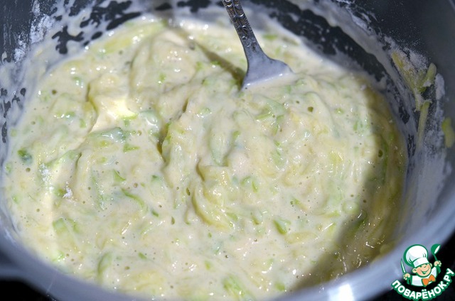 Яйца взбить, поперчить, перемешать с пропущенным через пресс чесноком. Перемешать с кабачками. Всыпать муку, перемешать до однородности. Соль до перемешивания с мукой добавлять не следует, иначе масса станет жидкой.