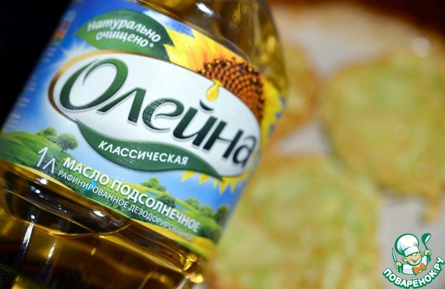 Обжаривать на подсолнечном масле Олейна с двух сторон до зарумянивания, в конце жарки накрывать крышкой, чтобы кабачок доготовился.