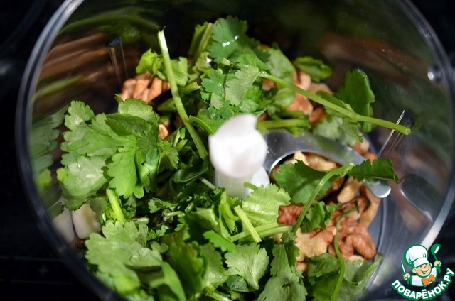 Делаем соус. В чашу блендера кладём орехи, чеснок, зелень. измельчаем.