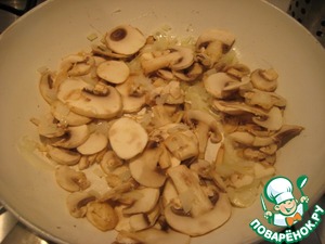 Грибы тонко нарезать. Добавить к луку, обжарить.