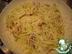 • Добавить капусту к начинке, обжарить на среднем огне 5 минут, затем накрыть крышкой и тушить на медленном огне до готовности.