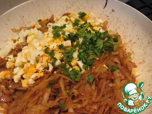 • Яйца вкрутую порезать кубиками, петрушку порубить. Добавить к начинке, посолить и поперчить.