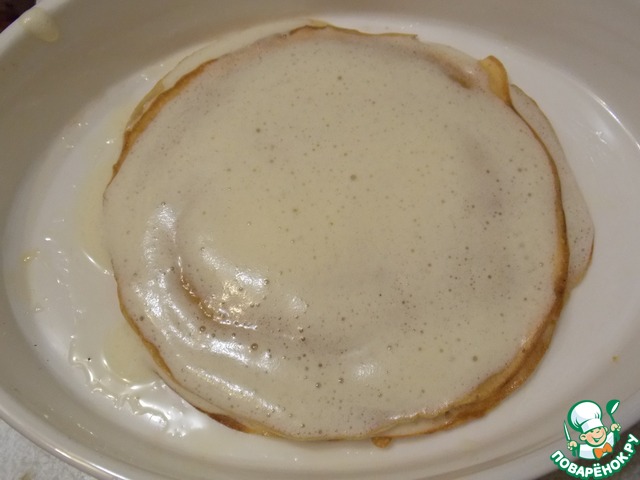 Укладываем в сковороду блины в семь слоев, предварительно смазывая каждый блин смесью масел и взбитым яйцом.