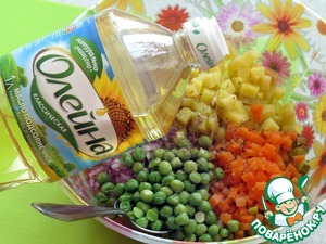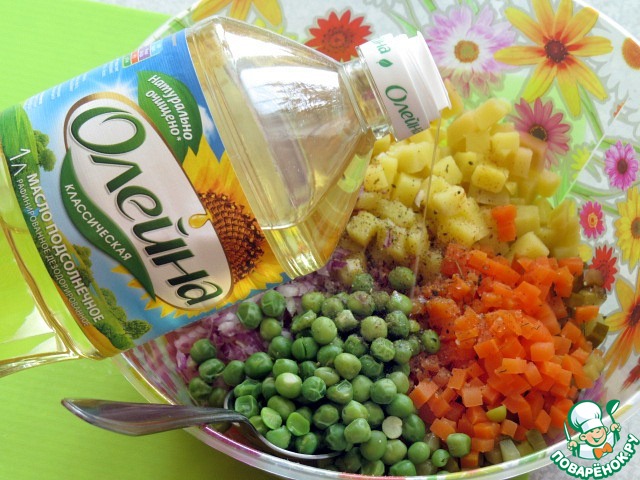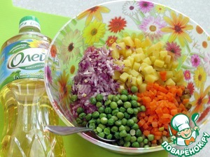Картофель и морковь отвариваем и также нарезаем кубиком. Зелёный горошек (у меня свежий, мороженый) отвариваем в подсоленной воде 7 минут. Лук мелко режем.