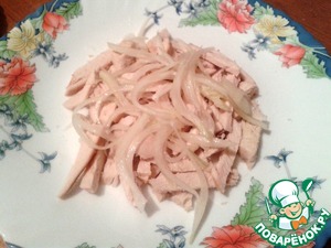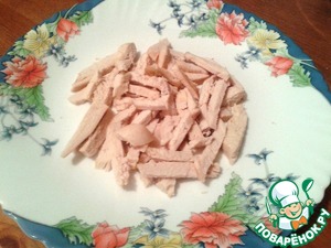 Приступаем к сборке салата. Первым слоем у нас будет куриное филе, нарезанное соломкой.