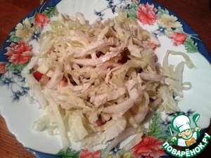 Следующим слоем будет, нашинкованная соломкой, пекинская капуста.