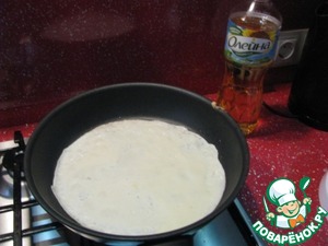 Начинаем выпекать. Для 1-го блина немного наливаем масла "Олейна!, тесто растекается очень плавно от середины сковороды, до краев.