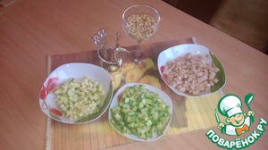 Итак, нам понадобятся - 2 банки обязательно консервированных кальмаров, 2 спелых, сочных авокадо, 2 зеленых яблока, 100 г кедровых орешков, которые и придадут неповторимую нотку в наши блинчики! И соевый соус - для заправки, также можно заправить подсолнечными маслом.