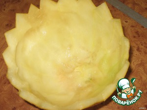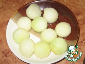 • Специальной ложечкой готовим шарики для украшения (при ее отсутствии можно сделать и квадратики или ломтики), остальную мякоть аккуратно удаляем ложкой. Дыню переворачиваем, чтобы полностью убрать сок.