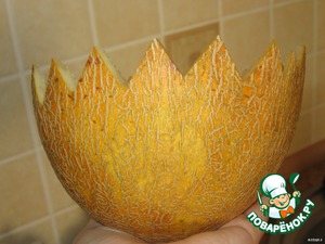 • Сначала готовим нашу салатницу: дыню разрезаем на две части, убираем семечки,