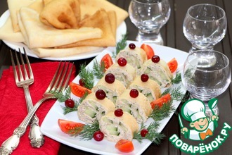 Блиный рулончик заверните в пленку и уберите в холодильник на пару часов. Перед подачей разрежте рулончики на две части и подавайте к столу.