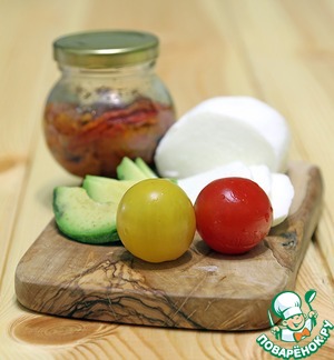 Так же нам необходимы два вида помидоров, томаты-конфи (или вяленые, рецептов на сайте достаточно, не стала повторяться), авокадо, моцарелла.