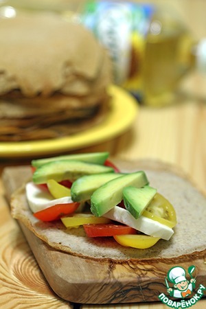Помидоры, сыр и авокадо мы наризаем пластинками, укладываем на блин, и отправляем в микроволкувку или на сковороду, чтобы моцарелла немного расплавилась. Можно и в духовку.