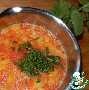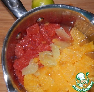• 2 апельсина, грейпфрут и лайм очищаем, и освобождаем мякоть от пленок. Из третьего апельсина выжимаем сок и добавляем его к мякоти. Листья мяты моем и мелко рубим.