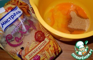 Два яйца разделяем на желтки и белки, белки убираем в холодильник. К желткам добавляем два целых яйца и сахар. Взбиваем до образования пышной пены.