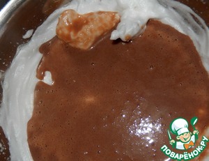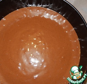 К яйцам всыпаем мучную смесь, как следует перемешиваем добавляем разрыхлитель. Готовое тесто выливаем с застеленную пергаментом разъемную форму (22-24 см). Ставим корж выпекаться до готовности.