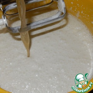 Белки взбиваем до твердых пиков, затем вливаем миндально желатиновую смесь и аккуратно перемешиваем.