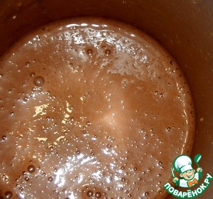 Через час, смешиваем кленовый и миндальный сиропы, добавляем желатин и 50 мл. воды, ставим подогревать на плиту и доводим до растворения желатина. Миндаль измельчаем до мелкой пыли. И подмешиваем к желатину.