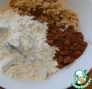 Духовку включаем на разогрев на 170 градусов. Смешиваем муку, какао-порошок и размолотые грецкие орехи.